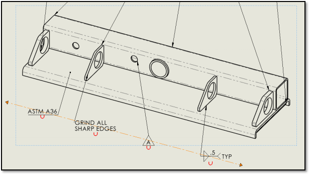 在SOLIDWORKS 2026中,您可以使用磁性线来对齐其他类型的模型注释,例如注释、焊接和表面处理符号、修订符号或几何公差。拖动注释以将其附加到可用的磁性线并重新排列顺序。或者反向操作:拖动现有磁性线,以收集其附近的任何注释