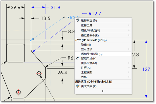 客户的工程图包含大量尺寸及注释,相互干涉遮挡以致难以看清,甚至导致制造错误。为了帮助解决这一问题,SOLIDWORKS 2026在尺寸线相交和重叠文本的地方添加尺寸断裂,即使添加或修改,移动等操作只点击尺寸右键更新尺寸断裂即可,此增强功能提高了复杂图纸的清晰度和可读性,以避免混淆和误解