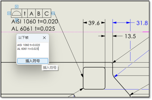 在几何公差框格中输入任何数字、字母或符号的组合,如:角度度数,分 (') 和秒(")以及字母文本等各类符号,并且在特征控制框四周添加第二文本框,详细注释几何公差要求,此增强功能为用户在更复杂的使用场景中指定几何公差提供了额外的灵活性