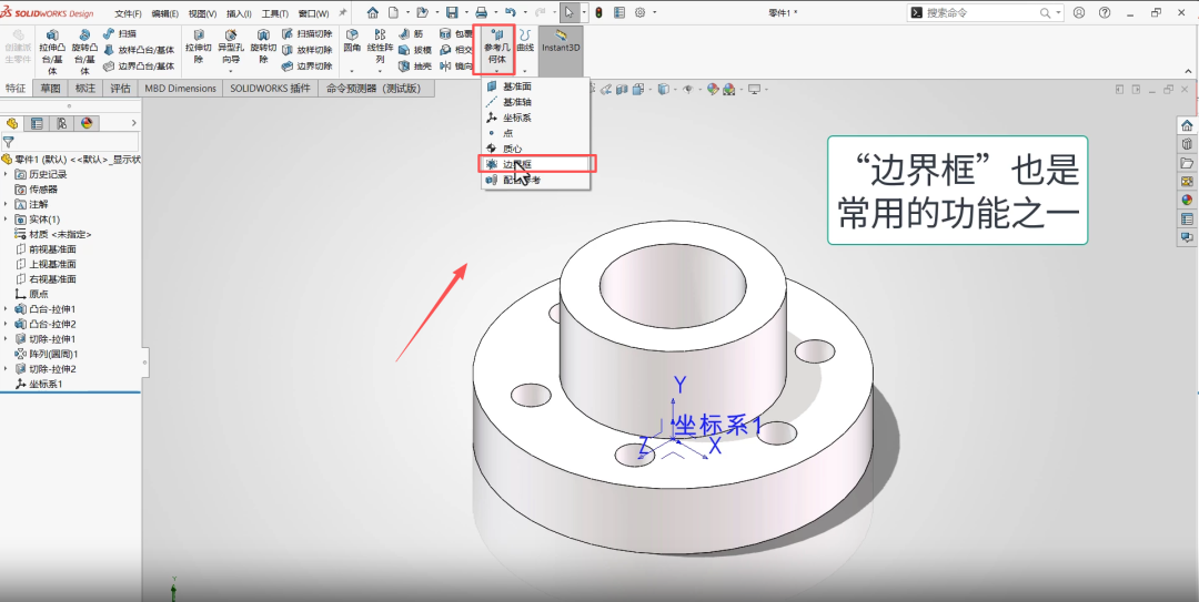 边界框常用于估算零件体积和包装尺寸,现在可以指定自定义坐标系来生成边界框。边界框方向通常基于默认坐标系,对于倾斜等特殊零件计不太实用。