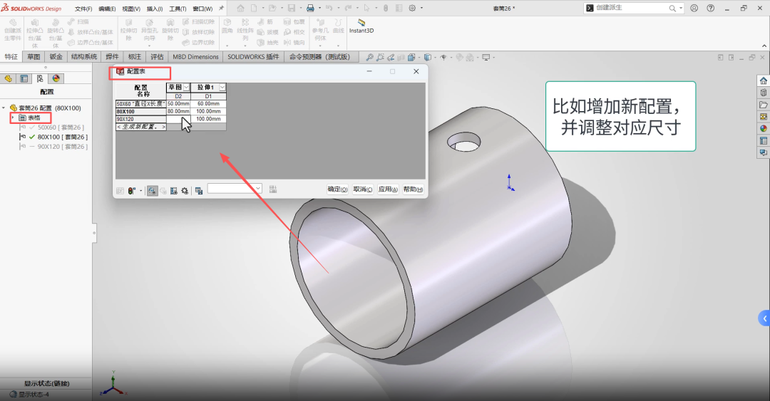 当模型有多个配置时,达索系统SOLIDWORKS会自动生成一个表格。在此表格中,可以直观地添加/删除配置行,并在列中集中修改不同配置下的尺寸、压缩状态和自定义属性